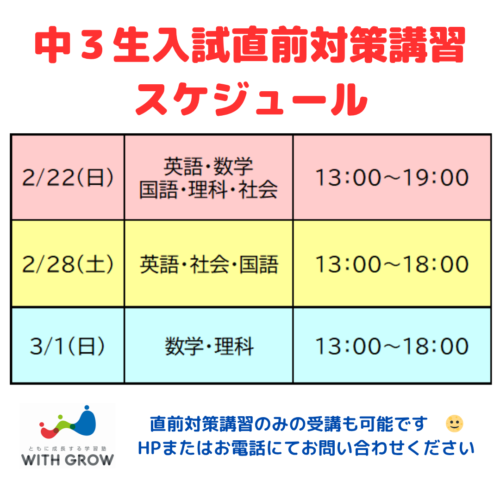 《★中3生入試直前対策講習★》3日間の16時間集中特訓を実施します! 2026.01.29 特別講習&イベント 中3生対象《入試直前対策講習》2/22(日)・2/28(土)・3/1(日) 県立高校一般入試に向けて、ラストスパート‼ 直前3日間で5科目の16時間集中特訓を実施します。