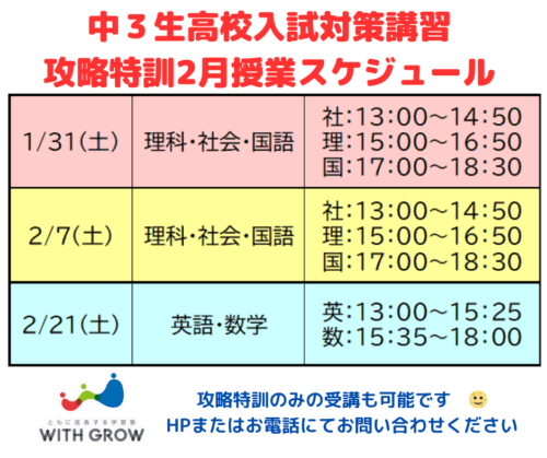 WITH GROW《中3生高校入試対策講習》攻略特訓授業!(1・2月ご案内) 2025.11.28 お知らせ 中3生対象《高校入試対策講習》9月~3月初 英数国理社の攻略特訓授業を土曜日に実施します! ※塾生以外の方も参加可能です。(お申込みは教室までお問合せください) ※ホームページのお問い合わせフォームより、お申し込み可能です。 満席になり次第、募集を停止いたします。