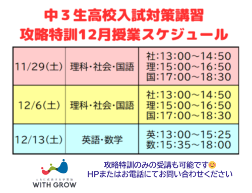 WITH GROW《中3生高校入試対策講習》攻略特訓授業!(11・12月ご案内) 特別講習&イベント